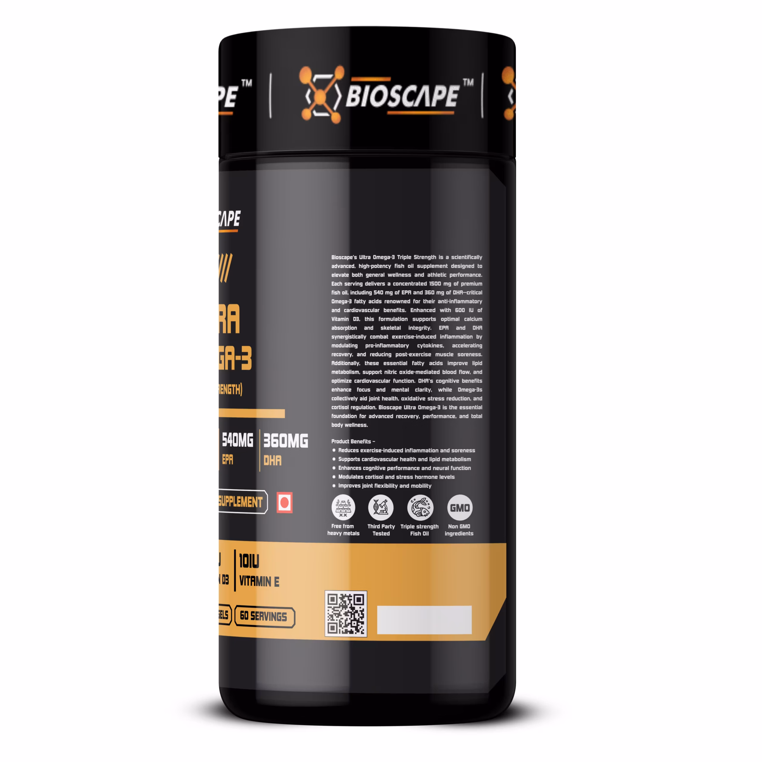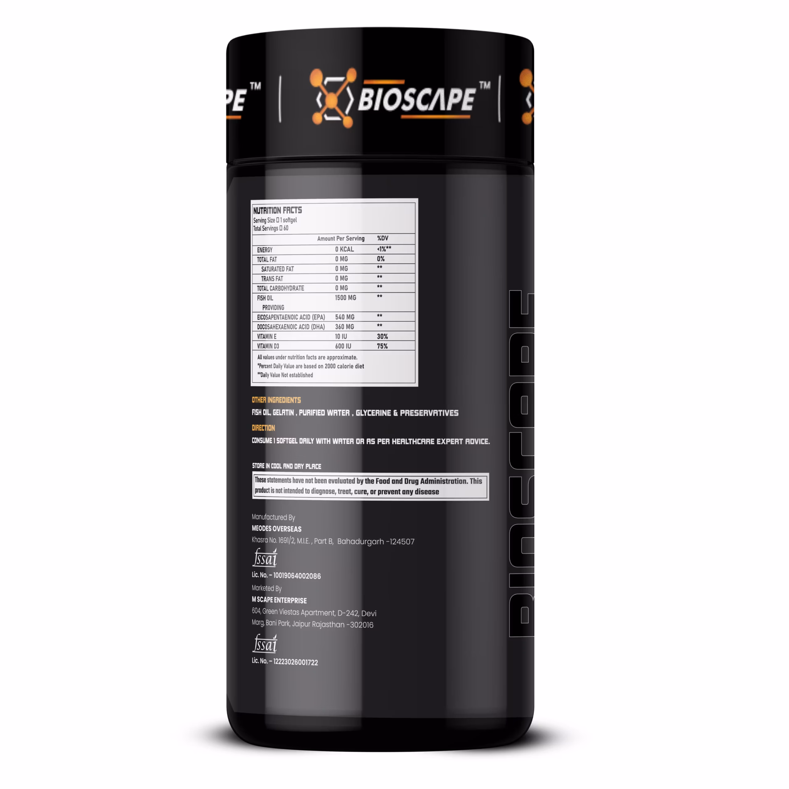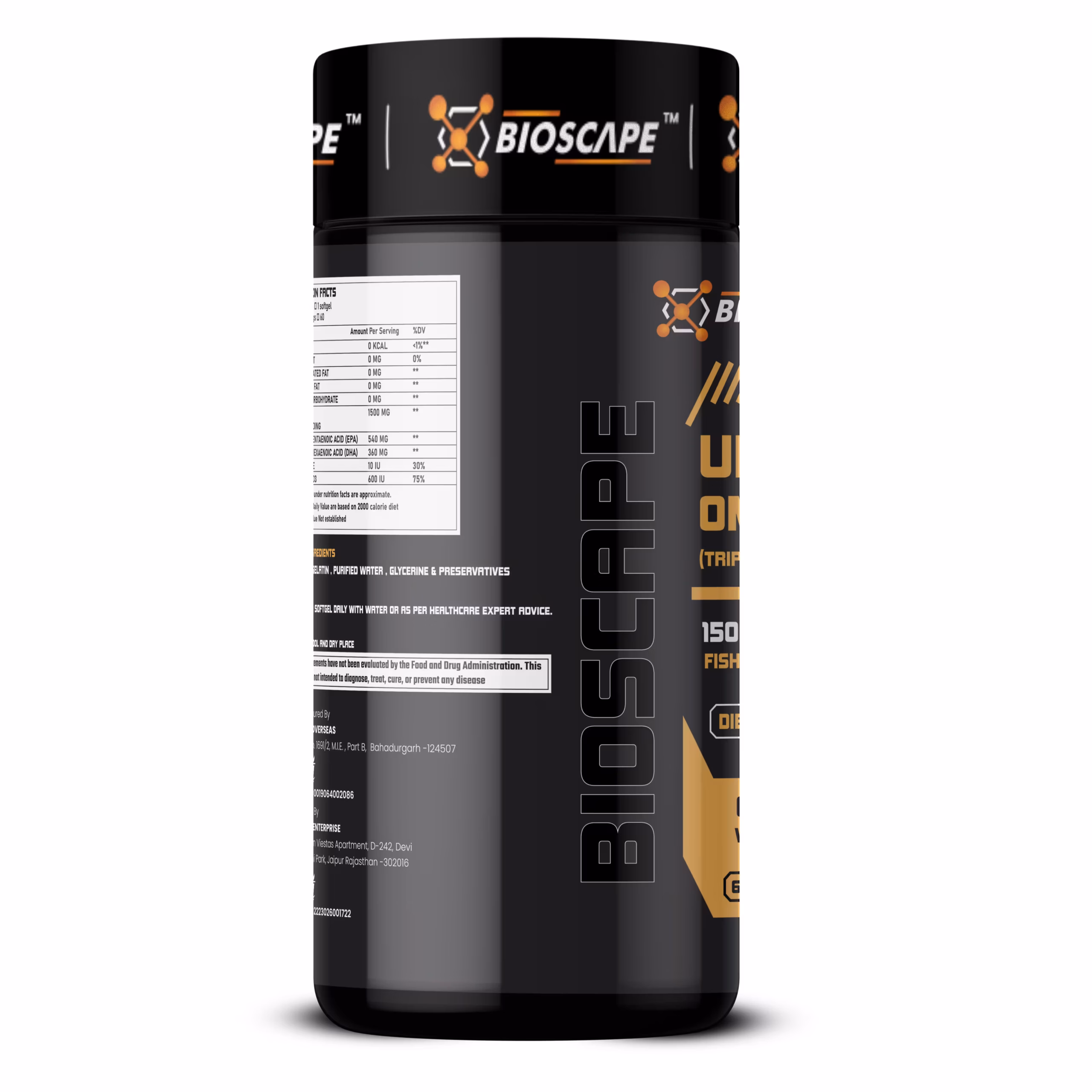 Bioscape Ultra Omega-3 provides a high-potency dose of essential fatty acids in just one softgel. Each serving delivers 1500mg of Fish Oil concentrate, including 540mg of EPA and 360mg of DHA—the two most beneficial Omega-3 fatty acids.